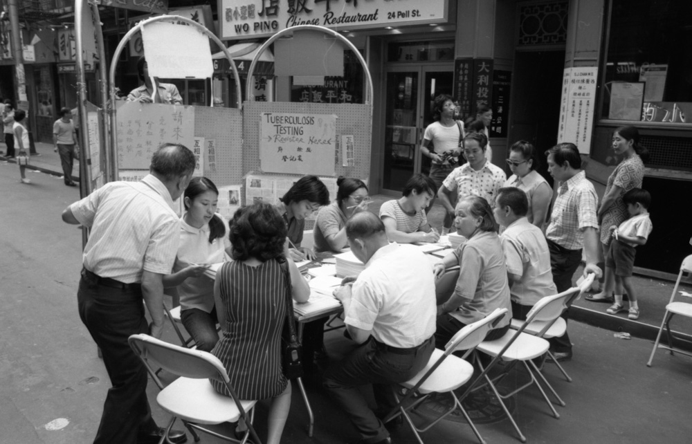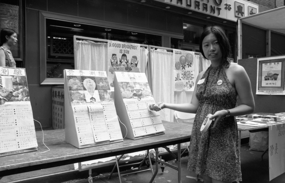 租户权利展台张贴的双语海报向居民普及了住房法律知识,鼓励他们抵制不公正的做法。例如,随着新移民的涌入给唐人街本已有限的住房存量带来压力,一张海报指出了房东在允许新租户搬入公寓之前向他们收取“礼金”——有时金额相当于几个月的房租——的普遍做法。在妇女健康展台,志愿者向女性讲解了乳房检查的重要性,并鼓励她们登记进行乳房 X 光检查。在营养展台,纽约大都会乳业委员会的营养师 Virginia Tan 随时准备解答问题和提供咨询。海报上展示了中餐食材,例如白菜、豆腐、粉丝和猪肉香肠,代表了四大基本食物类别,这有助于她的讲解。超过两百名志愿者(其中许多是可以担任中文翻译的大学生)协助各个展位的医务人员为人们测量血压、进行结核病Tine测试,并采集血液样本送往贝尔维尤医院检查糖尿病、儿童铅含量过高和其他疾病。