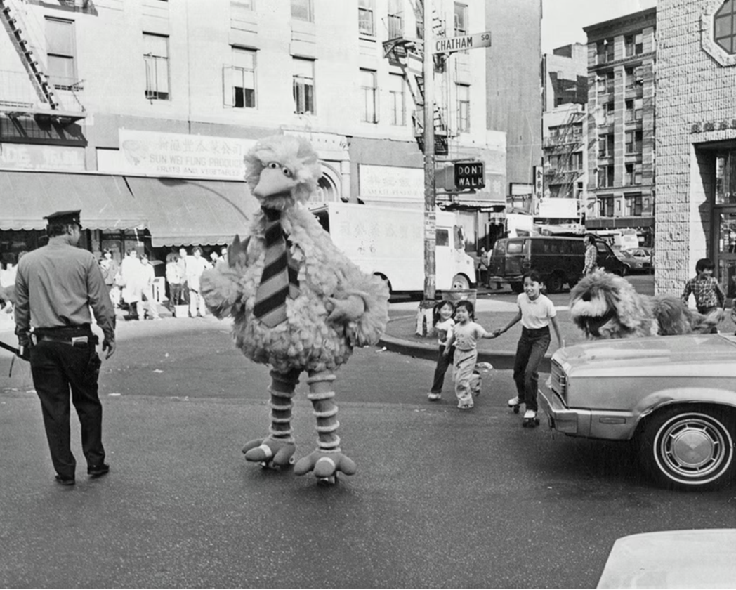这些大鸟在唐人街的照片拍摄于1982年,当时芝麻街的角色正在拍摄电视特别节目《大鸟在中国》。该节目于1984年荣获艾美奖最佳儿童节目奖。该特别节目讲述了大鸟访问中国并向美国儿童讲授中国文化的故事,其灵感来源于扮演大鸟的木偶师卡罗尔·斯宾尼。1979年,斯宾尼曾前往中国拍摄NBC特别节目《鲍勃·霍普访华之路》,这是美国同类综艺节目首次在中国拍摄。回国后,他向《芝麻街》的编剧兼制片人乔恩·斯通提出了制作大鸟特别节目的想法。儿童电视工作室(现芝麻街工作室)随后联系了中国中央电视台负责人张主席。这促使他们进行了为期五周的中国之行,为节目寻找拍摄地和演员。中国场景在北京、桂林和苏州拍摄,美国场景则在纽约唐人街拍摄。中国制作团队坚持要选一个中国孩子来和大鸟一起出演。在走遍了北京的日托中心和幼儿园后,六岁的欧阳莲子被选中。这次旅行还促使《芝麻街》的制片人建议在1981年将节目配音成普通话,以吸引中国观众,这比1983年《大鸟在中国》的上映早了两年。中央电视台的高层同意了,结果,《芝麻街》第12季被配音,并成为中国儿童电视的主打节目。