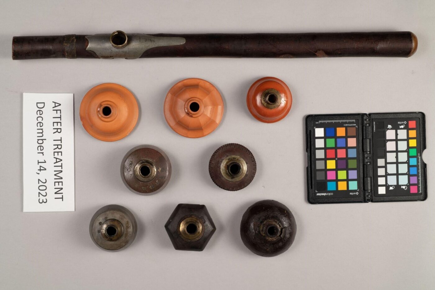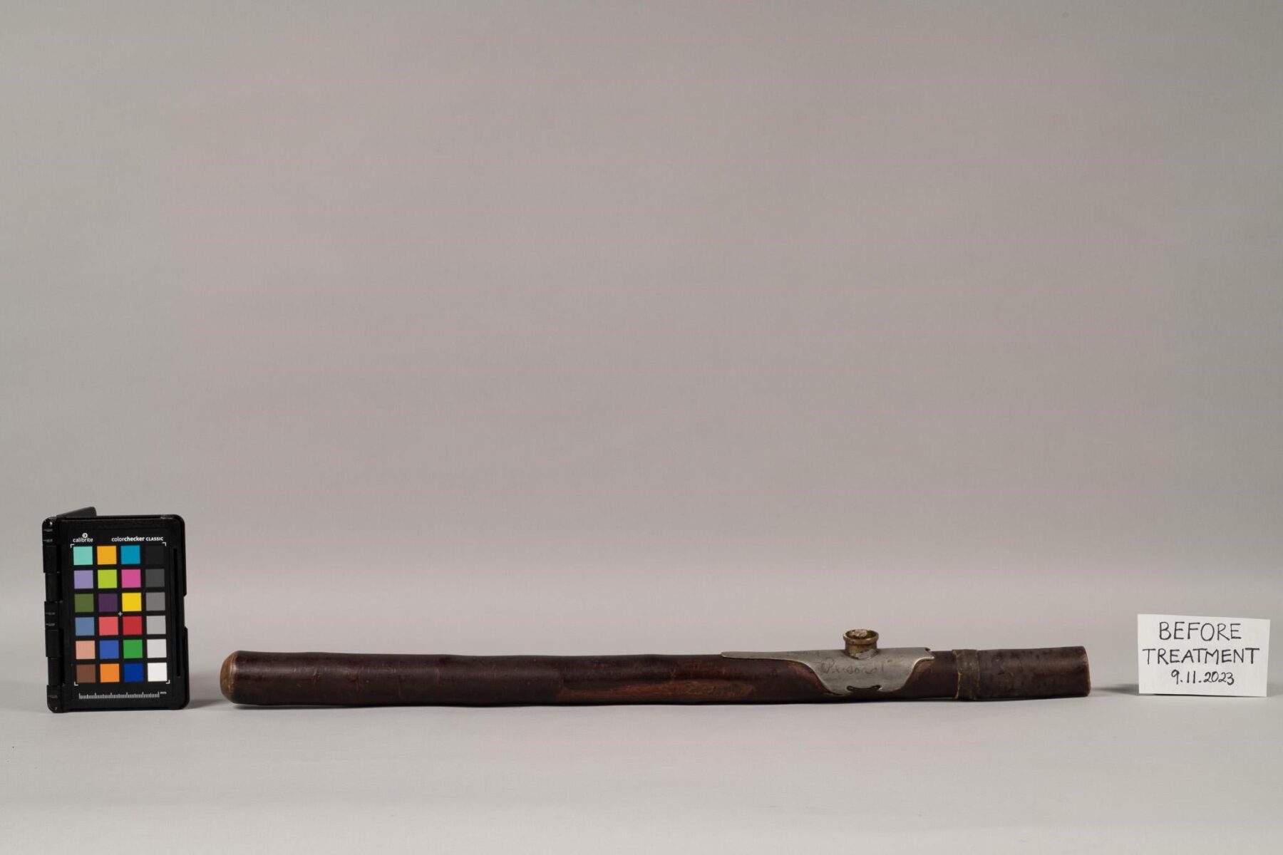Much of the condition of this object is probably evidence of use. The literature tells us that the darkened color of the wood pipe was a desirable feature that occurred over time through frequent use. The many hairline cracks that can be seen in the ceramic bowls are documented as a typical condition representative of the many instances of heating and cooling that accompanied the practice of ingesting opium. Much of the soiling and residues on the interior are probably a material known as dross, which is the toxic byproduct formed from heating the resin of the opium poppy. Bowls would need to be cleaned of dross after each use, especially in high-end contexts. For all of these reasons, heavy-handed cleaning of this object was not the priority for treatment, since these residues should be preserved for possible future analysis. Instead, the treatment addressed the instability of the lacquer element of one of these bowls, which was flaking and had detached from its support. A scientific analysis of the resin found inside the bowls is forthcoming, and may be included in a future exhibition of the pipe and its bowls.