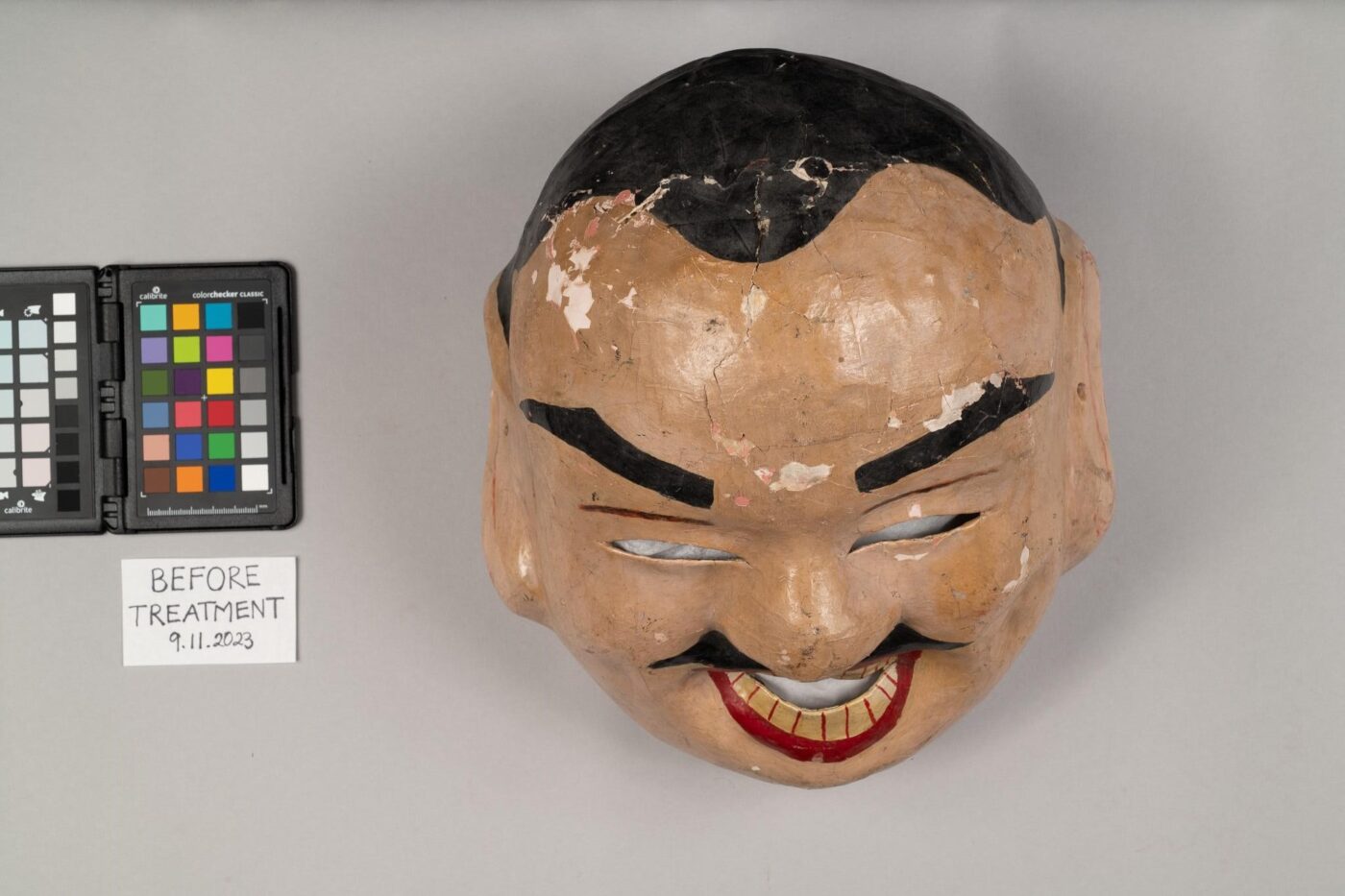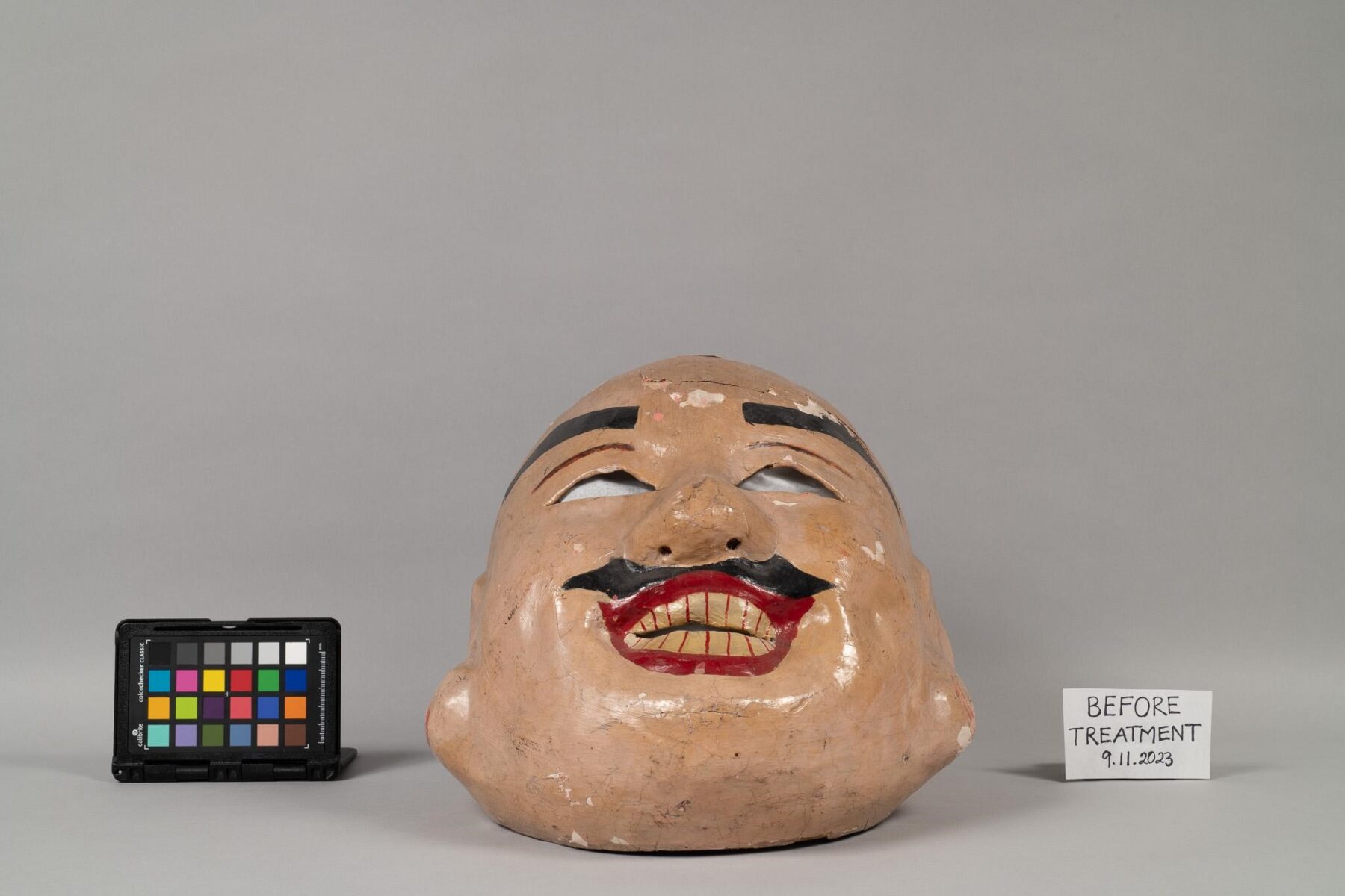 The second object treated in the fall of 2023 is the big-headed monk mask, which can be found in the collection with its associated accession number 2008.018.012. This object was collected by MOCA staff in the late 1980s, ultimately to be displayed in the exhibition called Where is Home that went on view in 1996. Masks such as this example were used in performances of the Lion Dance, which is performed on the Lunar New Year and other special occasions to bring good fortune. Each mask represents a different character, and each character has a specified role within the dance. The Lion Dance combines dance, history, and martial arts, and all performers are trained in these three arenas. This is a big-headed monk mask (daaih tauh taht), and this character would perform a comedic role within the Lion Dance. These masks for supporting characters such as the big-headed monk are traditionally made from papier maché and are worn over the head. These are secured during the performance with ties.