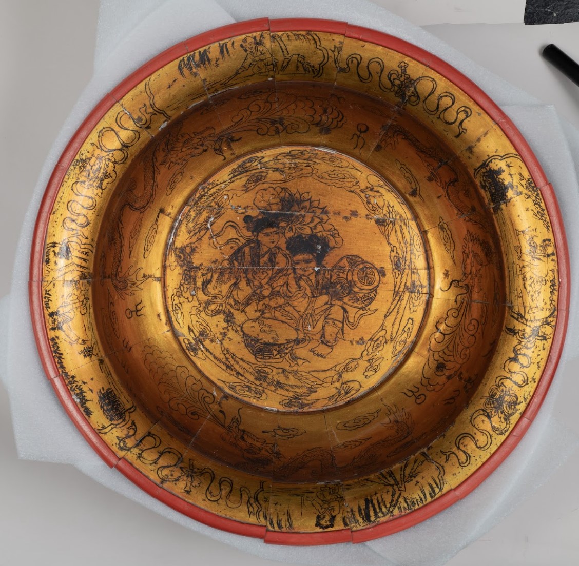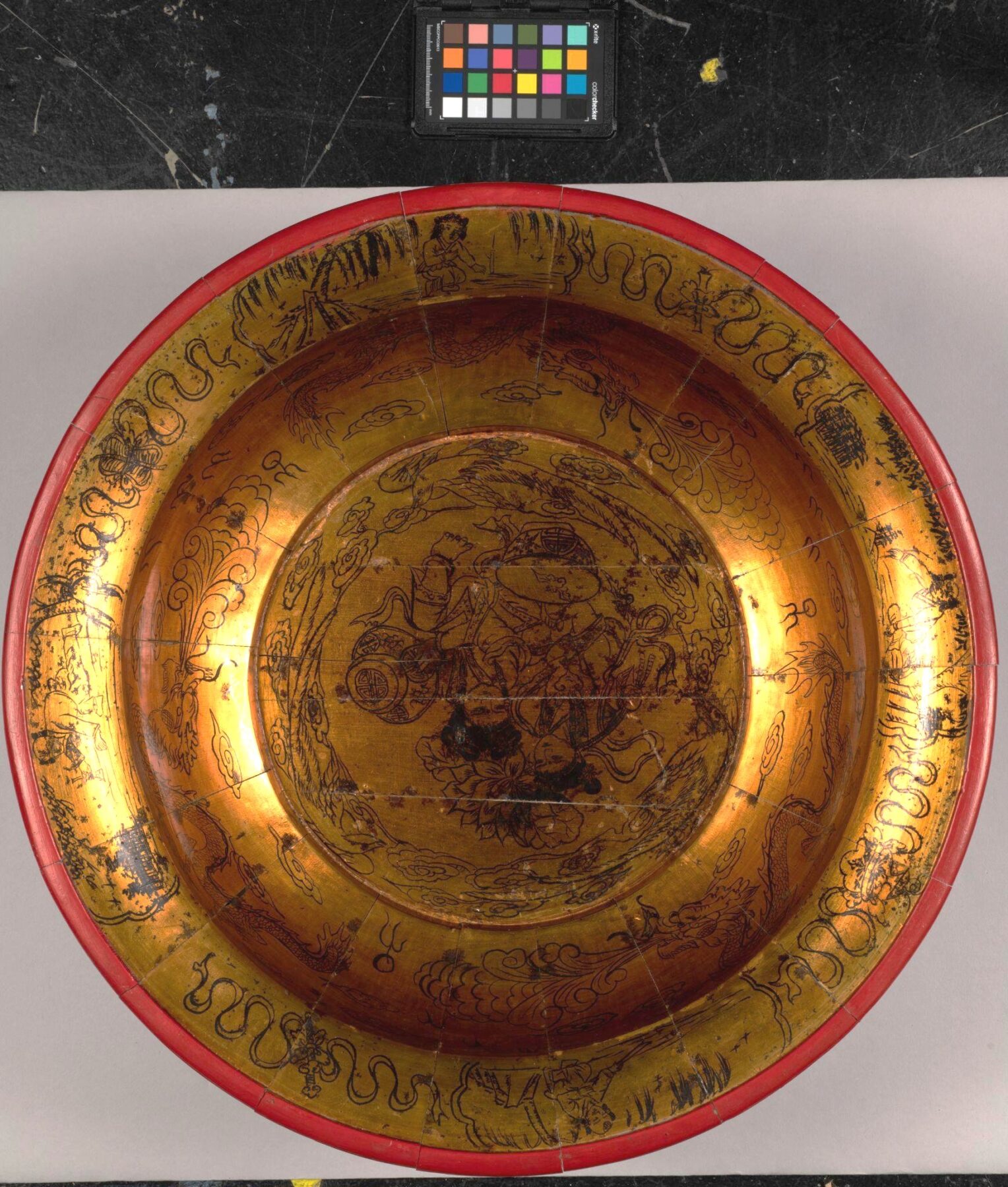 I completed some scientific analysis on the interior and identified the white metal as aluminum. I also found that the black ink areas contain manganese which probably means that the black colorant is a manganese-oxide. The yellow color of the interior surface might trick the viewer into thinking it was made of gold, but I did not detect any gold anywhere on the object. Instead, I identified what seemed to be an amber varnish, which is probably what gives the interior its yellow color. It likely took a great amount of skill to be able to imitate a gilded surface with these other materials. The exterior red surface was found to contain iron, so the red colorant is likely an iron oxide. I did not identify any lacquer in my analysis on the exterior, which leads me to believe that it is likely painted. The red paint, however, would probably trick the viewer into thinking that it is a red lacquer.