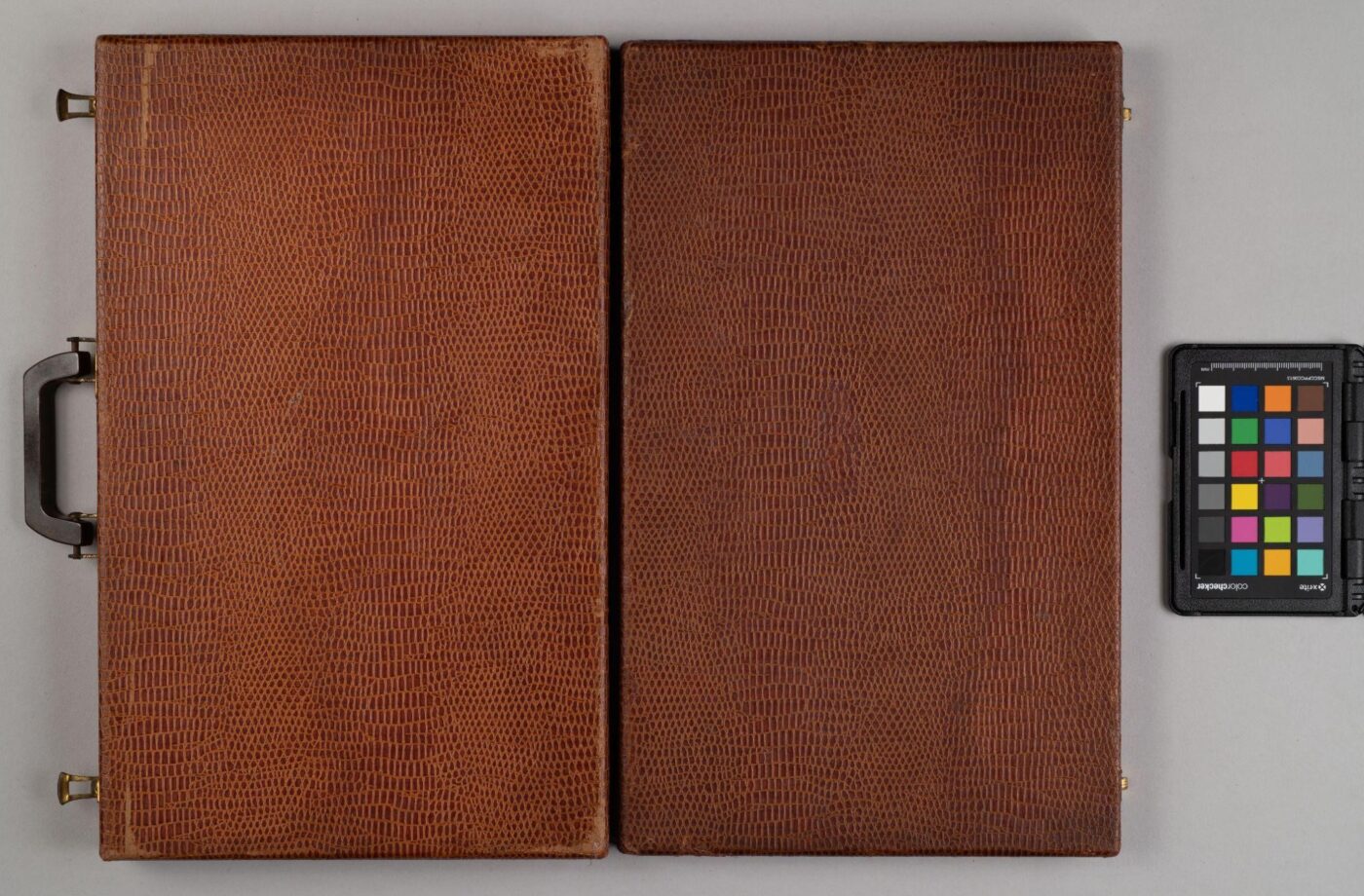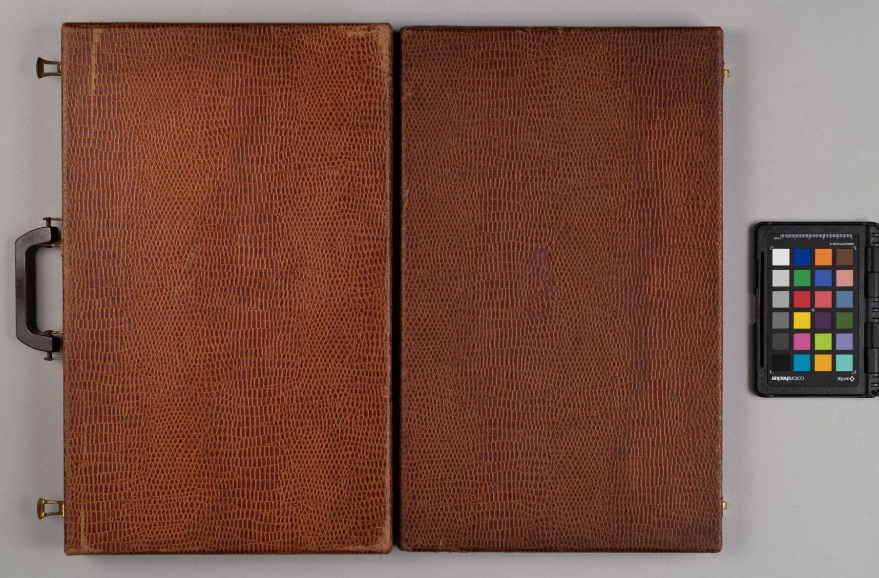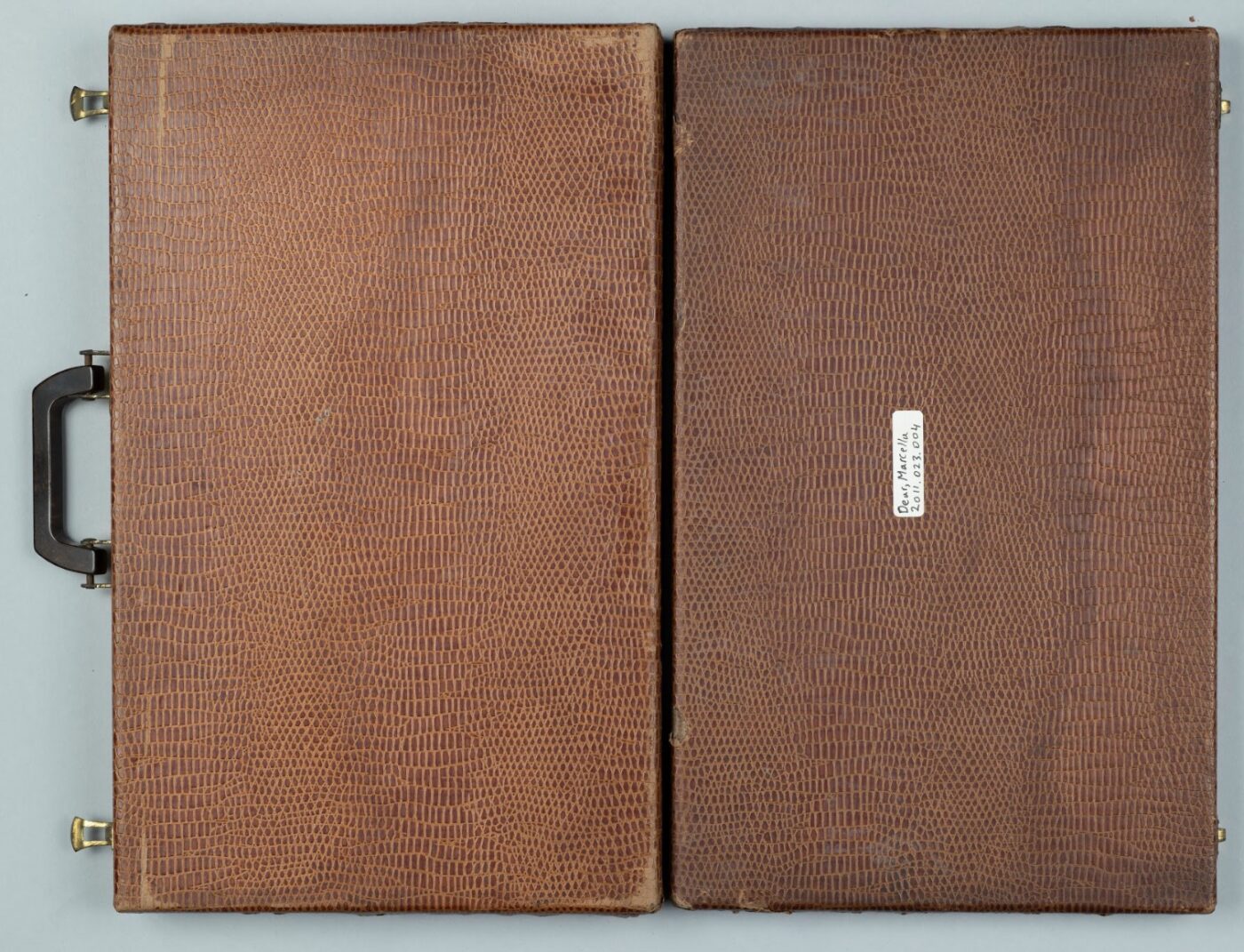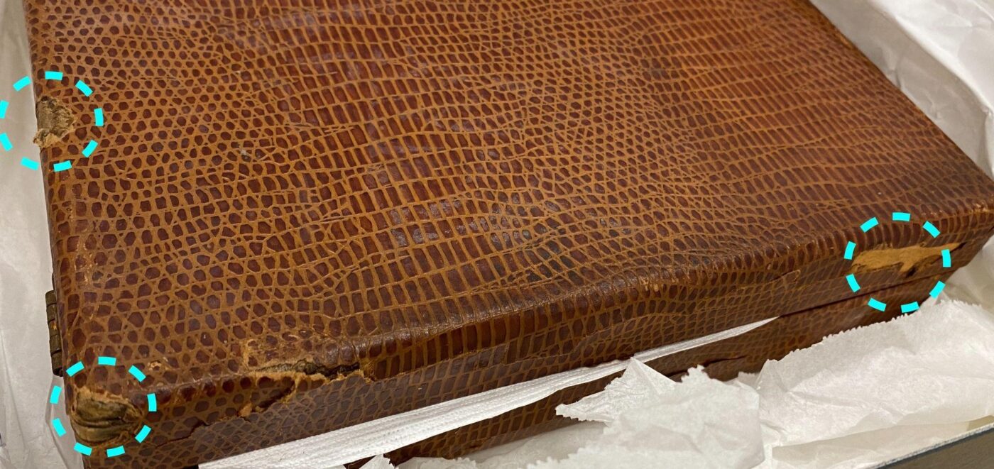 After gently cleaning the surfaces to remove loose dust and dirt, my main task was to stabilize this faux-reptile skin cover. I adhered the loose areas of the paper to the board. I then proceeded to perform fills in areas where there were losses using an appropriate tissue paper that was tinted to match the surrounding surfaces. I also reduced the blanching on the exterior and gently cleaned the plastic pieces. We decided to leave the tideline, as a permanent mark of the fire. I did not try to reduce it.