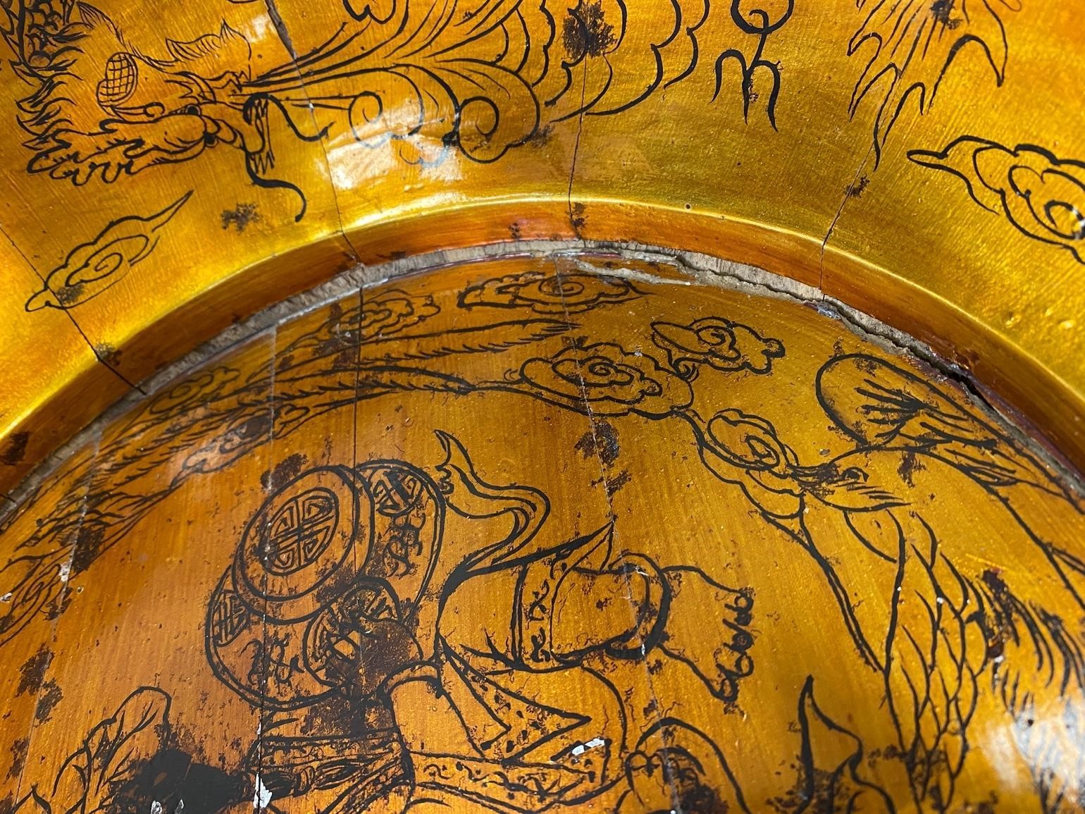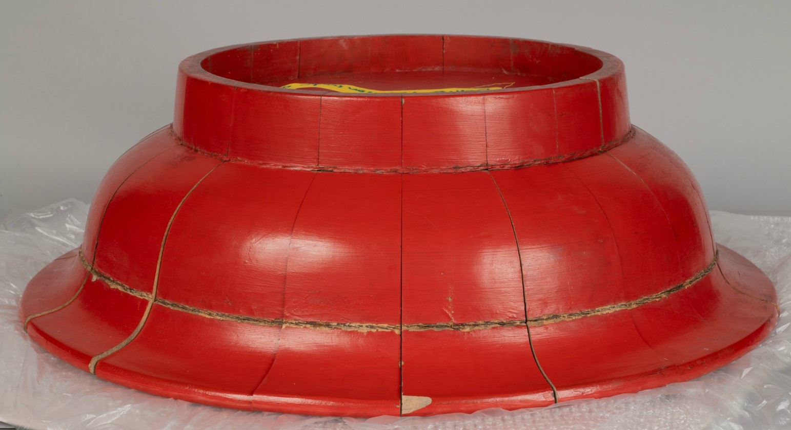 The red and yellow wooden bowl (Figure 1) was elegantly constructed. There are 17 individual vertical wood pieces that come together to make this circular bowl, and they are only held together with two wires wrapped and tightened around the exterior. The exterior surface is red and the interior surface is translucent, reflective, and yellow. The interior also has drawings of people, animals, and flowers drawn with black ink. There is no information about the object prior to joining the MOCA collection. It could have been decorative or used as a container to store items.