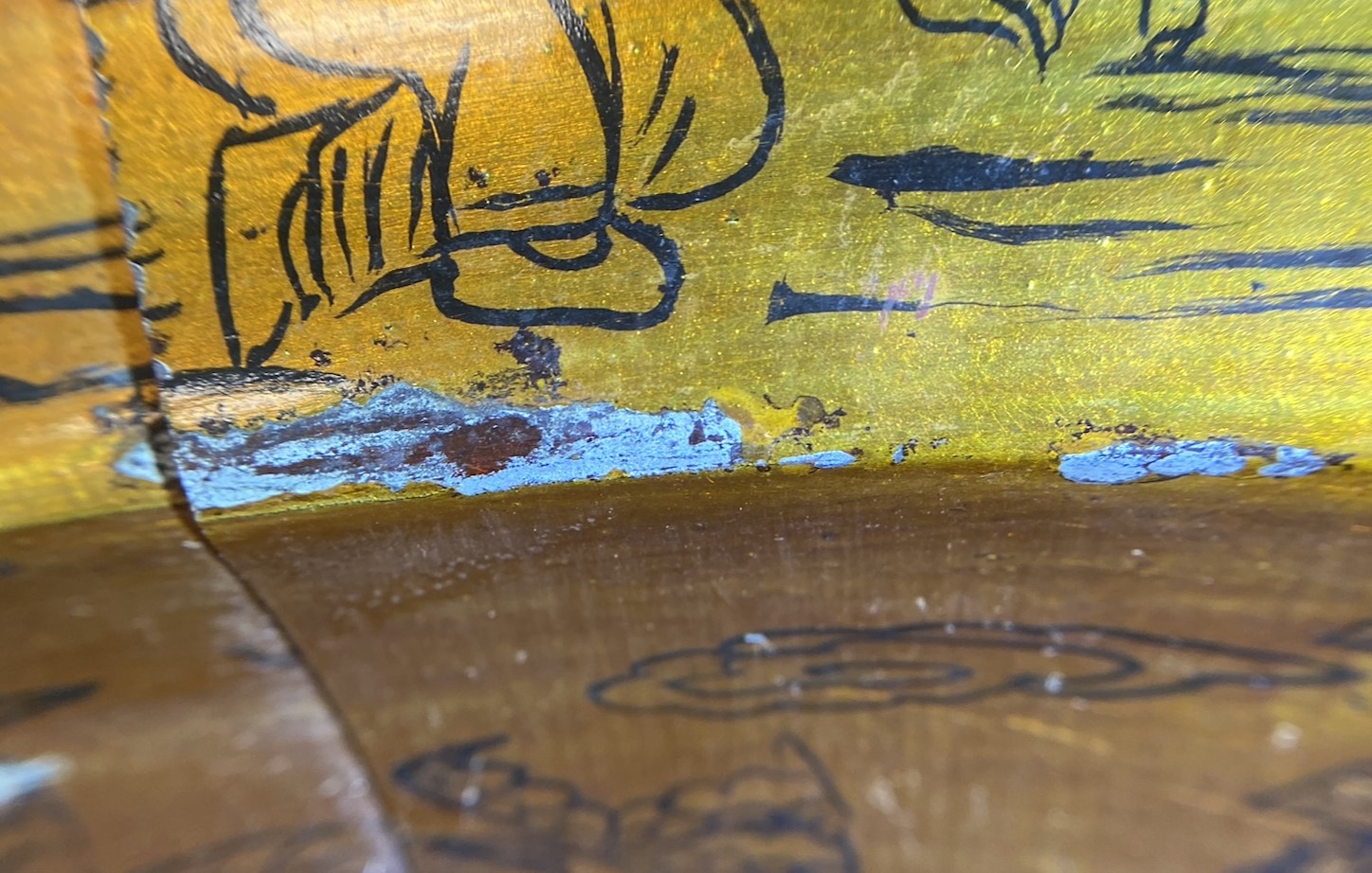 These damages revealed information about how the bowl was constructed. With the wood pieces shifted out of place, I was able to see that there was no adhesive between the vertical pieces. (Though, there are an additional three wood pieces that constitute the base which are adhered together.) There are hidden ridges across the bowl that accommodate the two external wires and the base on the interior. I was also able to see the layer structure of the interior (Figure 3) and exterior surfaces. The interior had a black layer, a translucent adhesive layer, a white metal layer, a black ink layer, and a transparent yellow layer. The exterior surface had a black layer and a red layer on top of that.