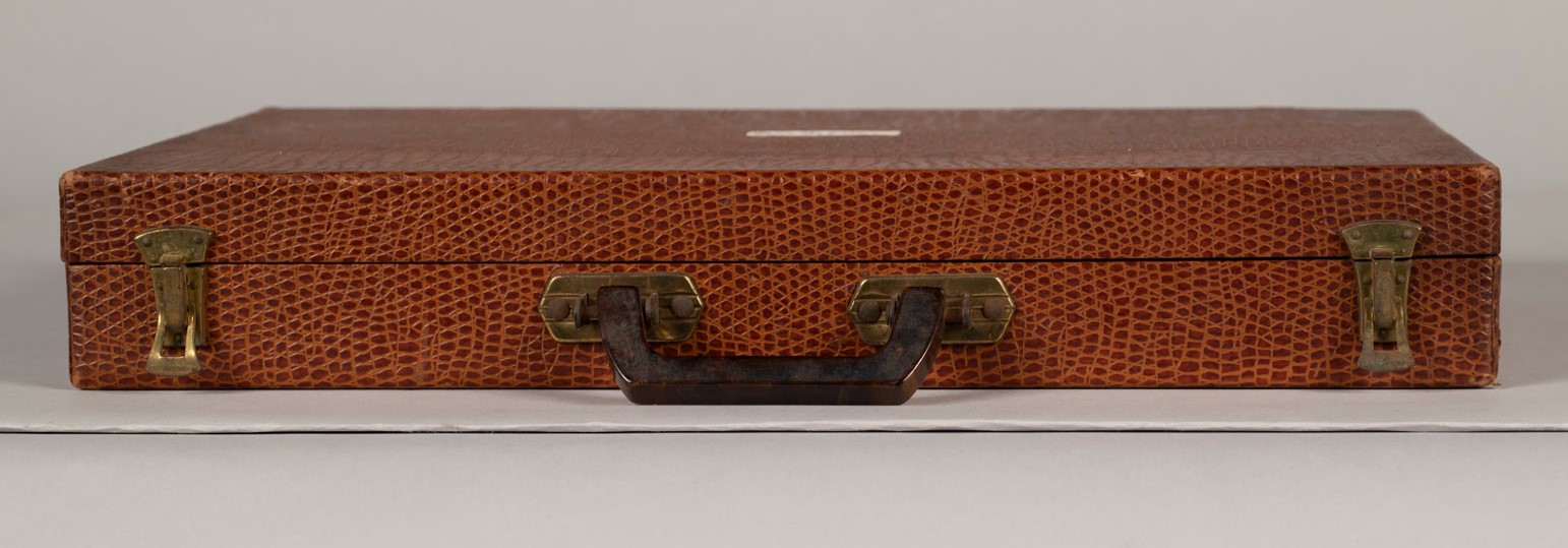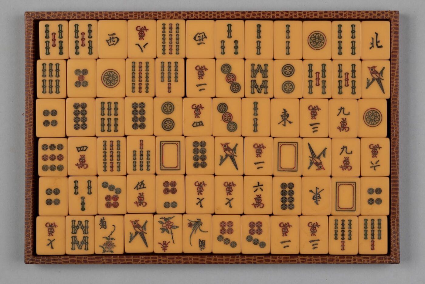 This mahjong set has mahjong tiles (Figure 7), two dice, and several circular discs that are spread across three trays in a case. The mahjong tiles were probably white at first and made to look like ivory, but they have darkened and yellowed over time because they are actually made of plastic and this has aged. I performed scientific analysis on the tiles and the data suggest that they are a phenol formaldehyde, which is commonly known by the commercial product name “Bakelite.” The game set case has a cover that looks like reptile skin, but close inspection reveals that it is actually made from a textured paper (Figure 8). It is a very brittle yellow paper with red-brown patterns. The paper is attached to a dense gray paper board that is only visible where there are missing pieces of the textured paper cover.